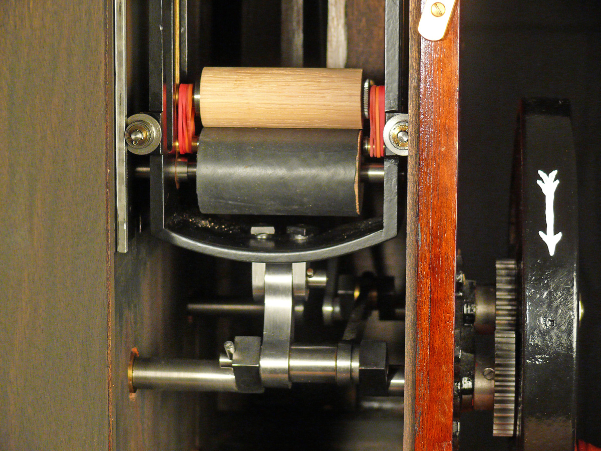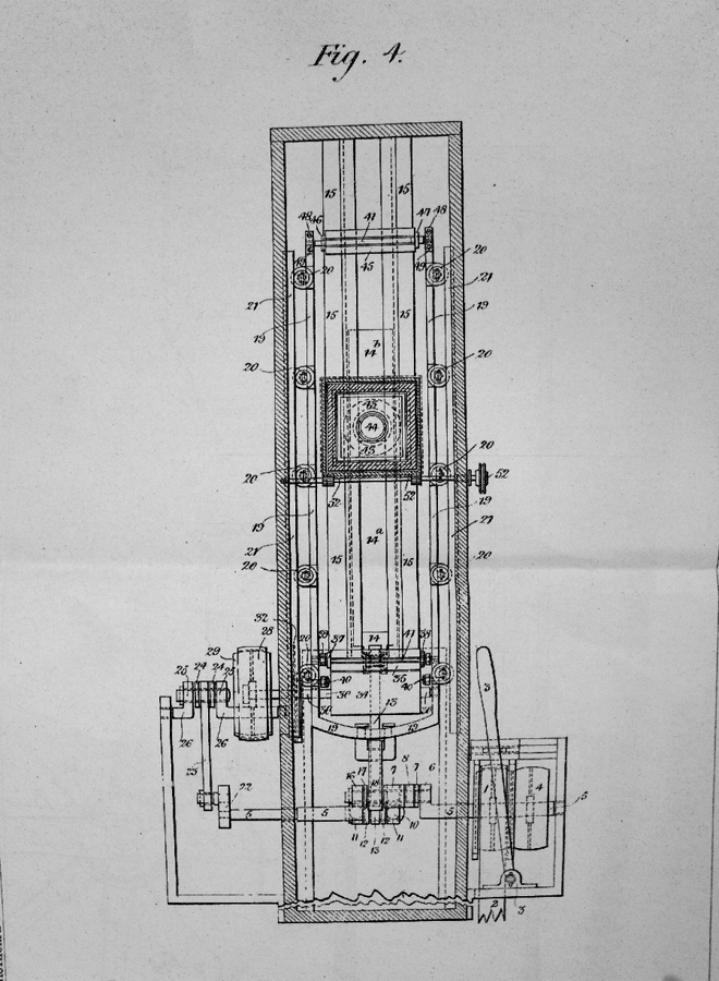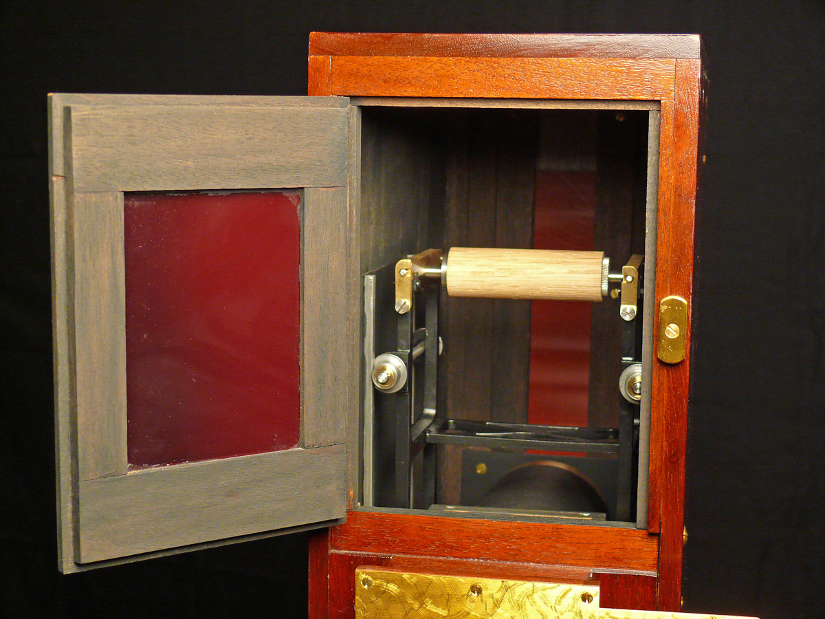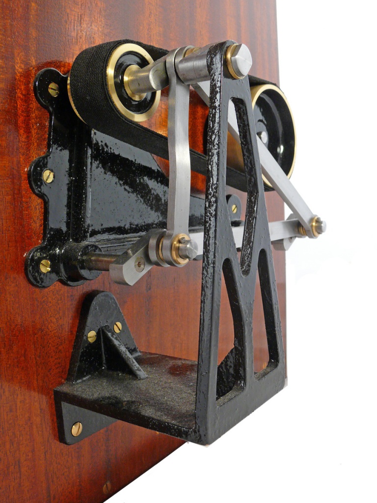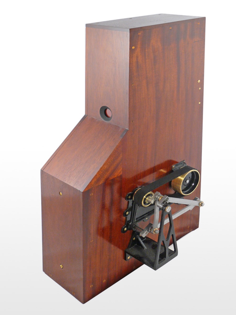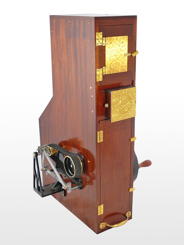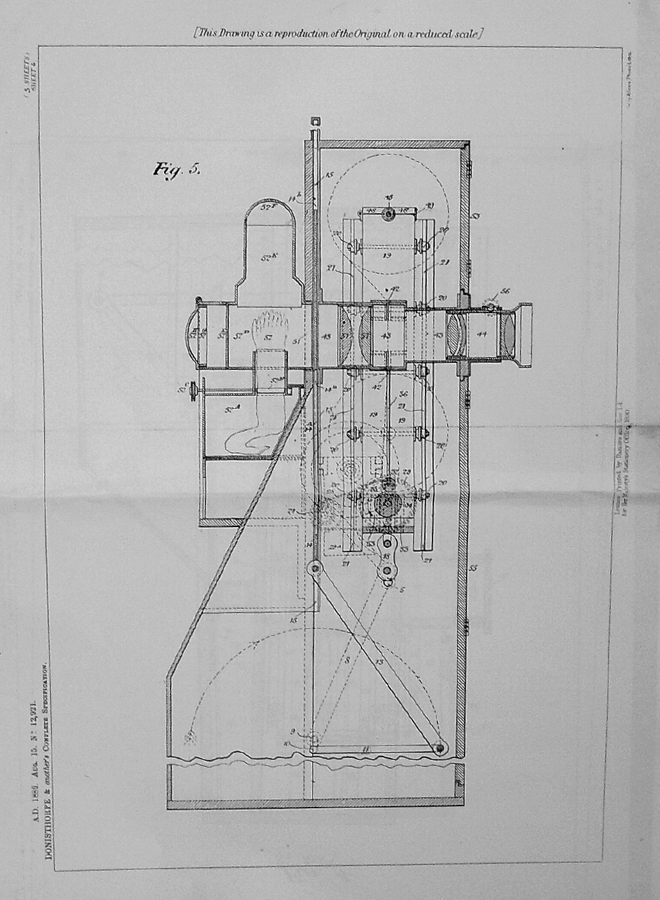 The ingenious 1889 Kinesigraph patented and created by political activists Wordsworth Donisthorpe and William Carr Crofts and long since lost, is a physically impressive and technically unusual camera, and one of the first replicas to be completed and successfully tested.Ten images from frames of the original test film of 1889/1890 showing London’s Trafalgar Square survive. The camera design owes much to the wool-combing machines developed by the fathers of Donisthorpe and Crofts, as told in the book Industry, Liberty, and a Vision (1998), by Stephen Herbert. Very recent research has unveiled details of a correspondence concerning Wordsworth Donisthorpe’s attempts to obtain funding from one of his late father’s colleagues to develop the camera, including public suggestions of blackmail.The heavy weight of the film ‘shuttle’ that travels up and down was a limiting factor in the running speed, but a late description in one of the photographic magazines concerning the use of a mirror gave a clue that the camera may have been converted to run on its side, with the lens pointing upwards and a mirror at 45 degrees in front of the lens. This would have meant that the heavy shuttle was running to and fro rather than up and down, which would have helped to increase the frame rate.It has also recently been established that Donisthorpe applied for his first patent for a mechanical device in 1868, while still a philosophy student at Cambridge. |