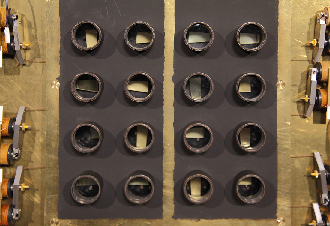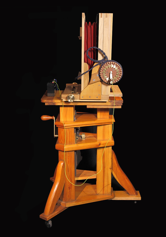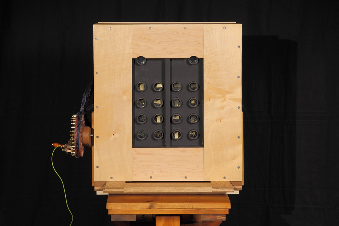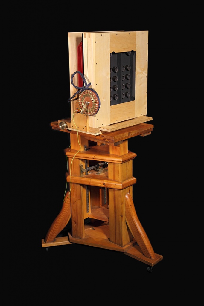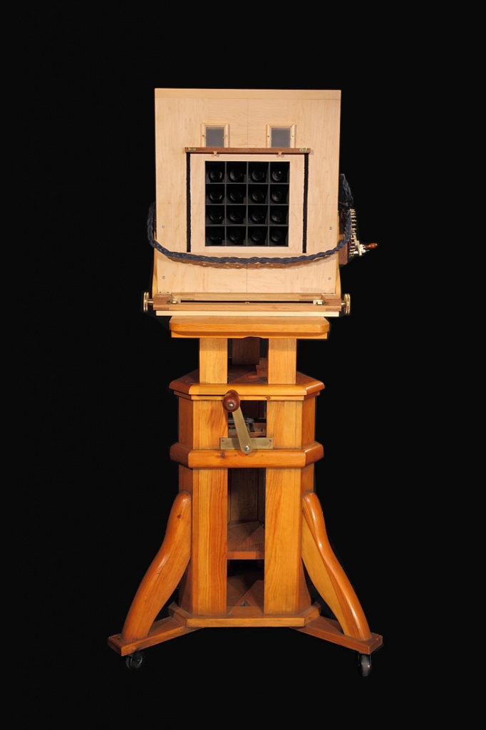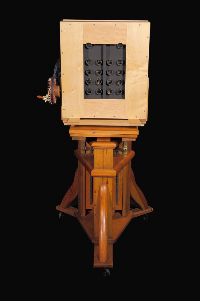 For his initial experiments c.1886-87, Le Prince used a camera with 16 lenses. It was intended to shoot on two alternating rolls of sensitive material to enable long sequences to be taken, but the camera was first tested with a static glass plate, for taking just 16 images. The shutters on the lenses are opened in sequential order by means of a series of electrical contacts.The original camera, without the film back, is in the collection of the National Media Museum, Bradford, England. |
