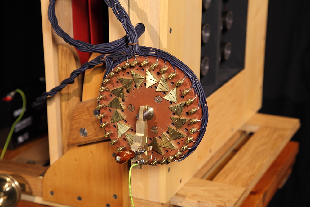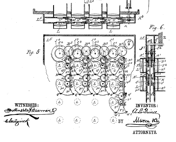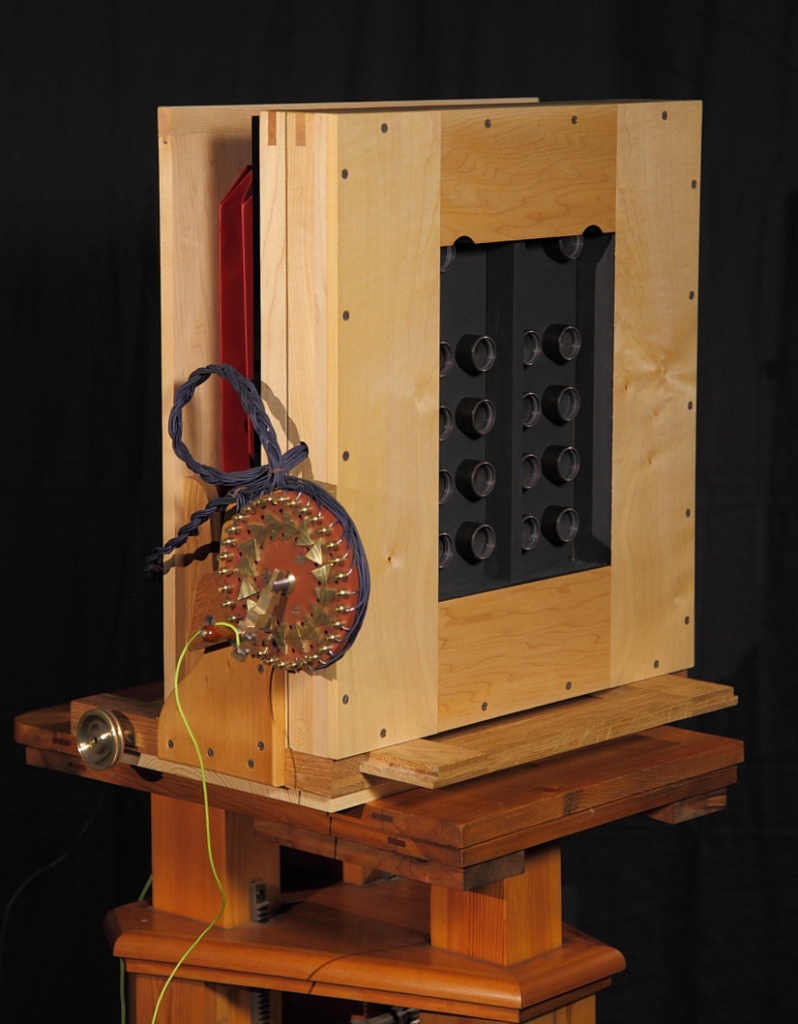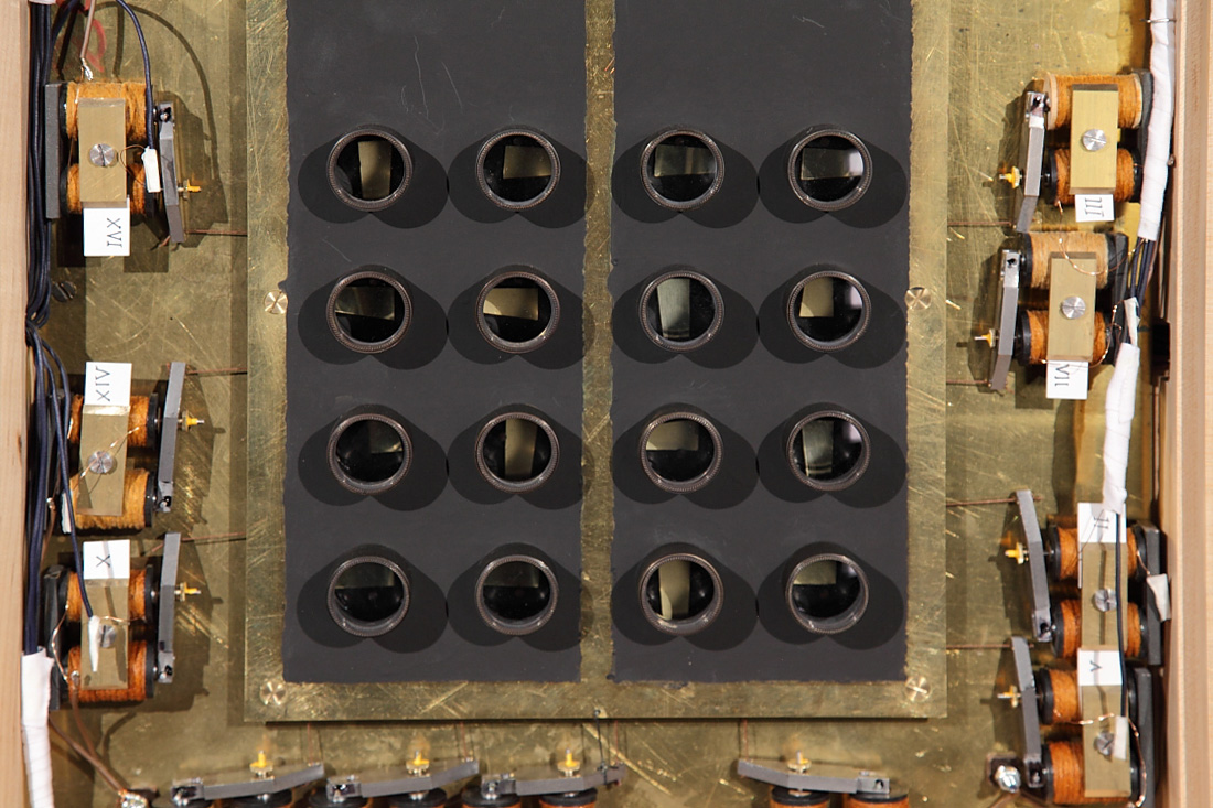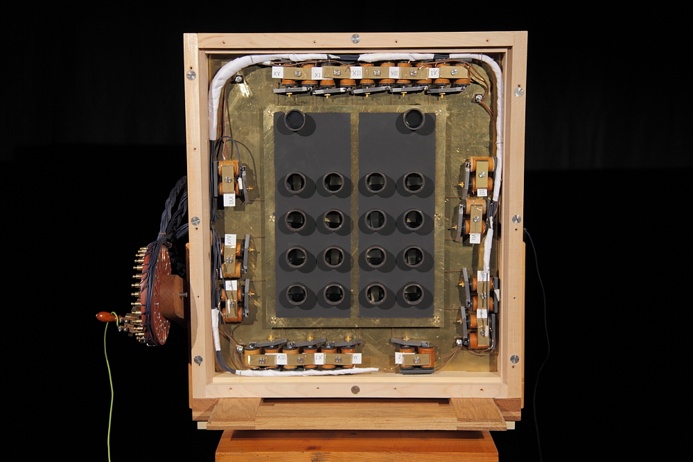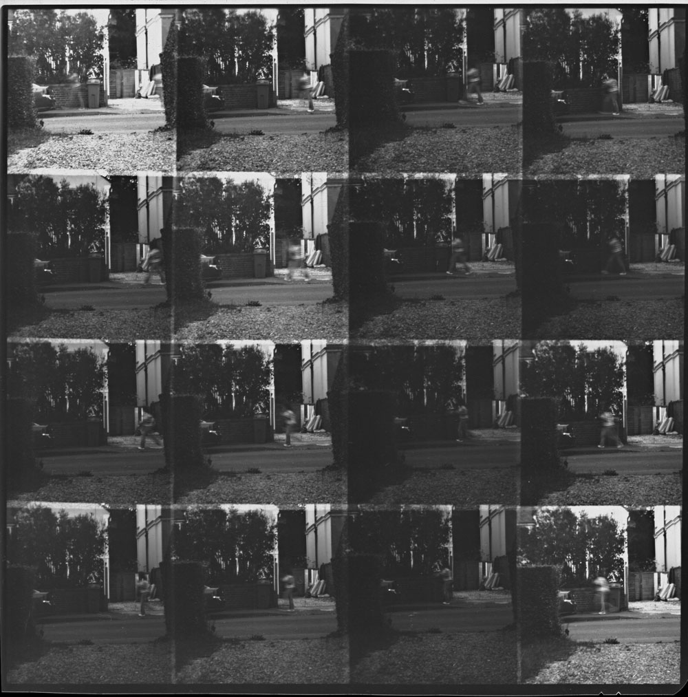 For his initial experiments c.1886-87, Le Prince used a camera with 16 lenses. It was intended to shoot on two alternating rolls of sensitive material to enable long sequences to be taken, but the camera was first tested with a static glass plate, for taking just 16 images. The shutters on the lenses are opened in sequential order by means of a series of electrical contacts.The original camera, without the film back, is in the collection of the National Media Museum, Bradford, England. |