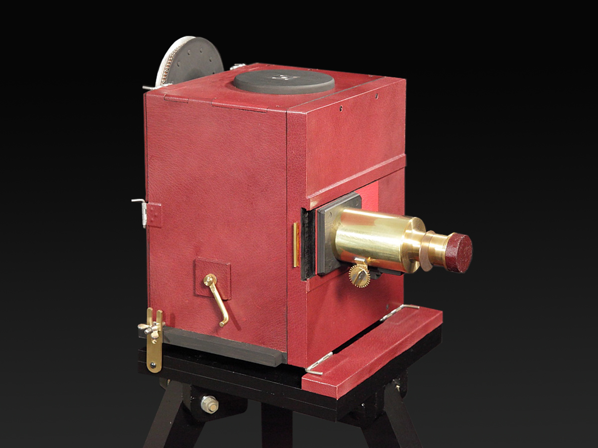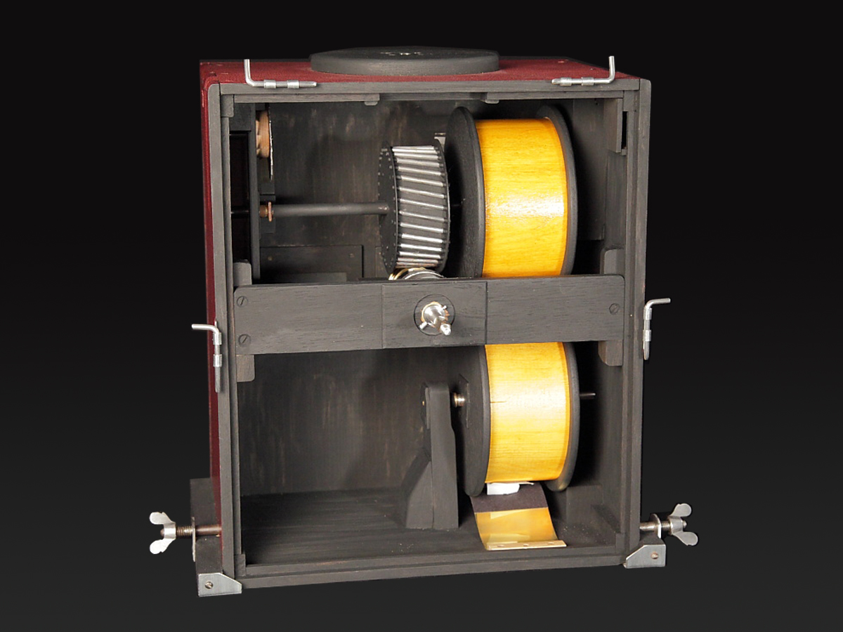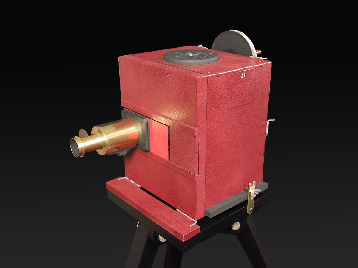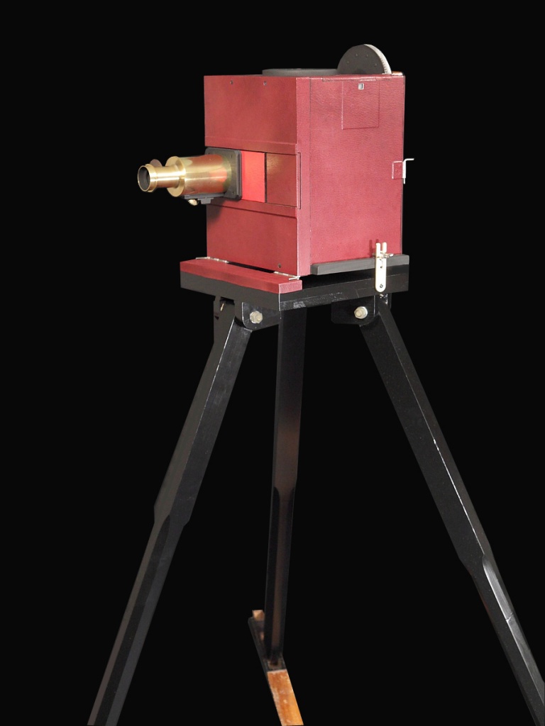 The working replica of the camera designed and built c.1894 (or earlier) by Max and Emil Skladanowsky, brothers in a family of magic lantern showmen, is a faithfully copy of the surviving machine.The rather crudely constructed camera was designed to accept unperforated celluloid film, and used a worm-gear intermittent movement, to shoot their first film footage, forty eight frames, of Emil.By mid summer 1895 Max had developed the Bioskop projector, a device using two loops of film.