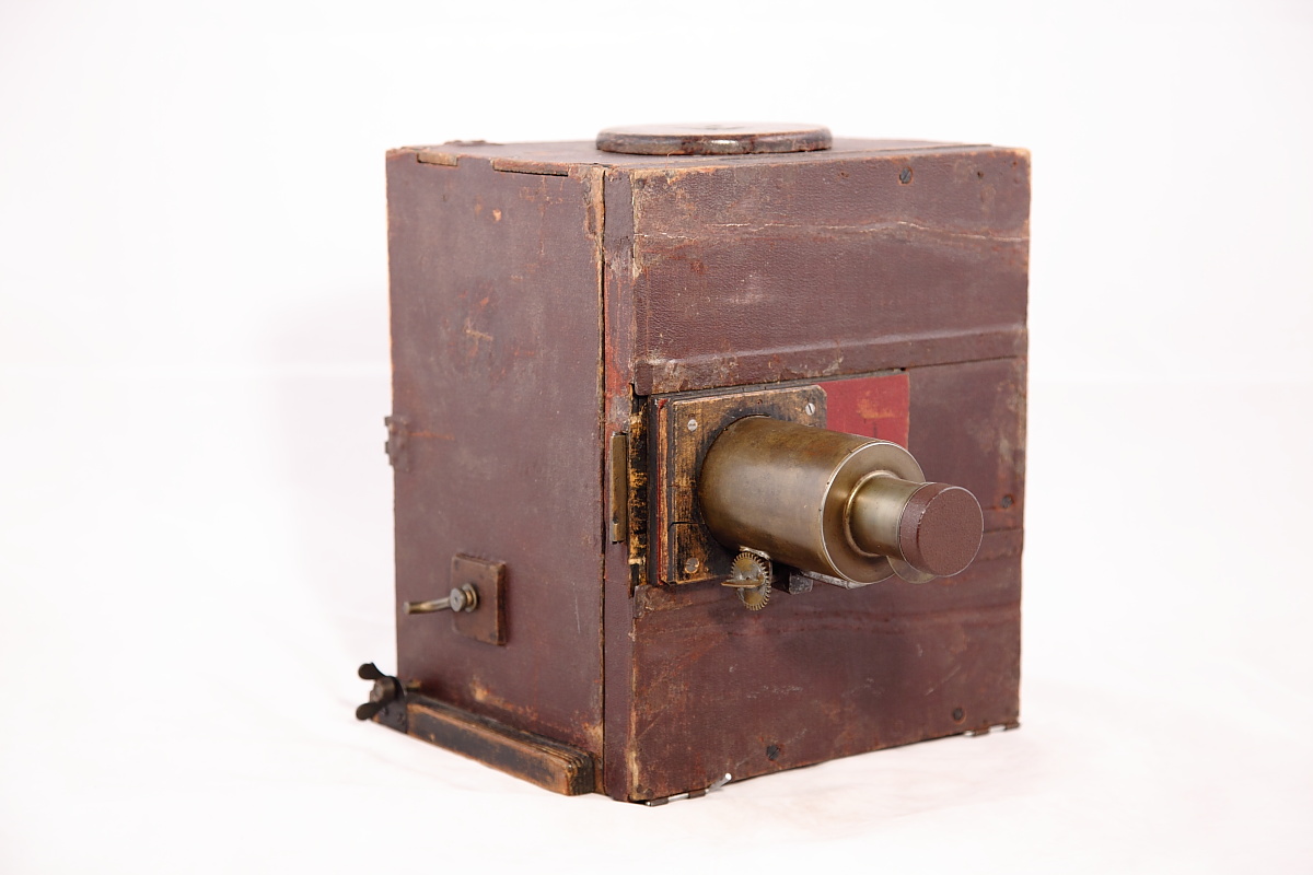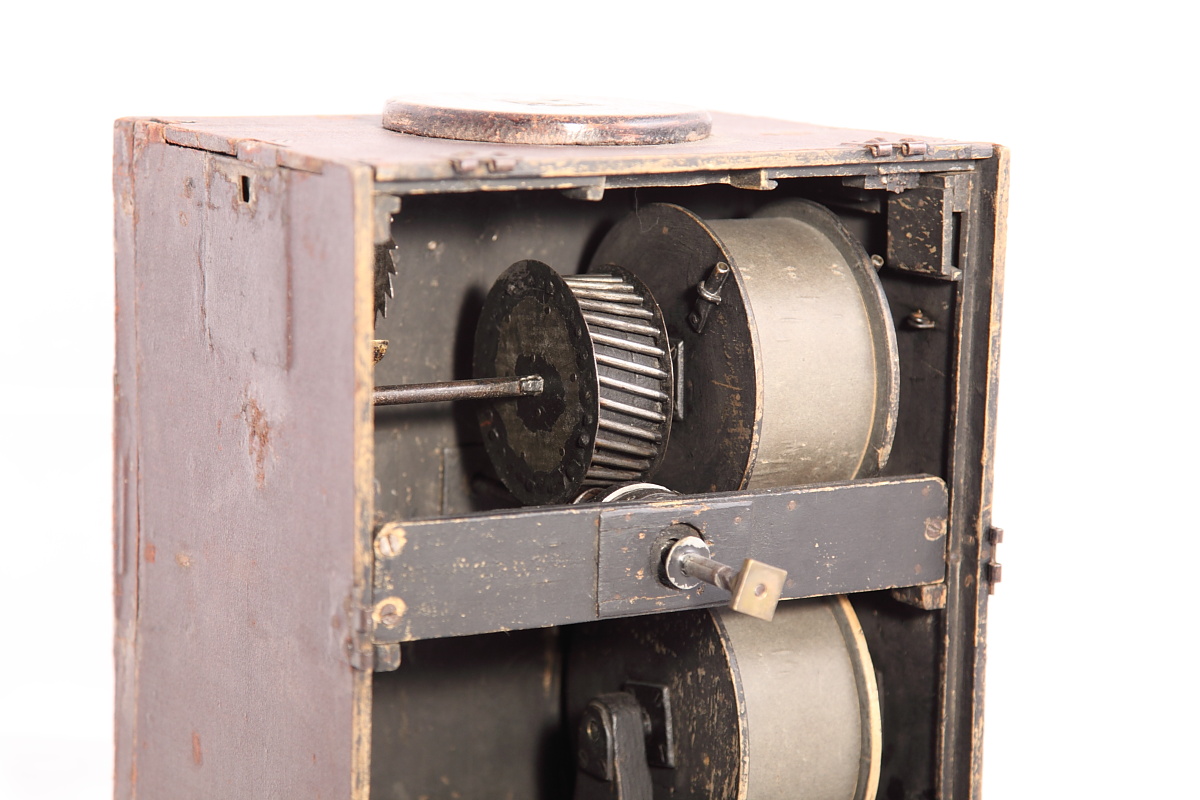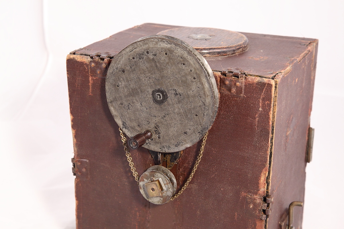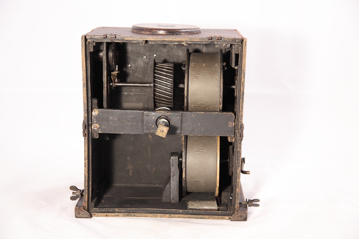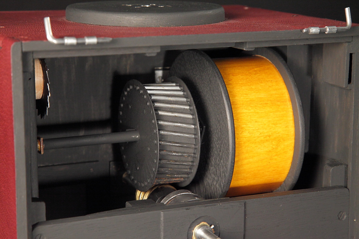 The working replica of the camera designed and built c.1894 (or earlier) by Max and Emil Skladanowsky, brothers in a family of magic lantern showmen, is a faithfully copy of the surviving machine.The rather crudely constructed camera was designed to accept unperforated celluloid film, and used a worm-gear intermittent movement, to shoot their first film footage, forty eight frames, of Emil.By mid summer 1895 Max had developed the Bioskop projector, a device using two loops of film.