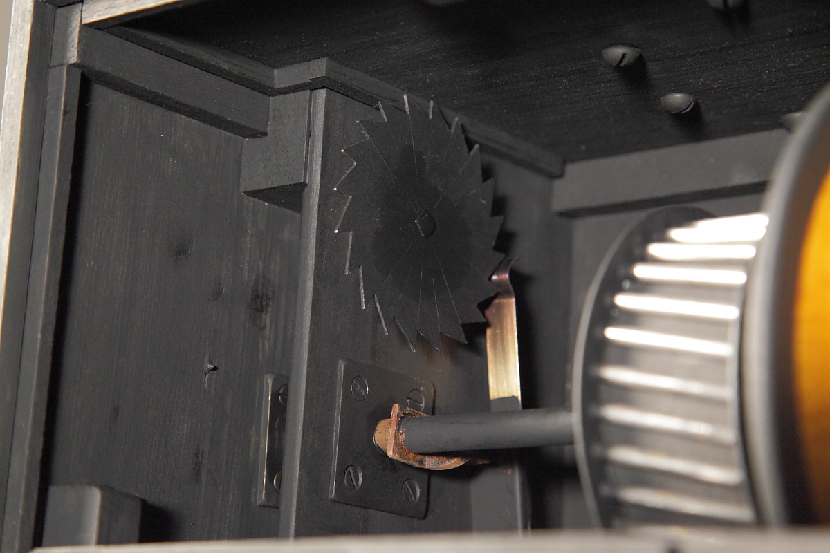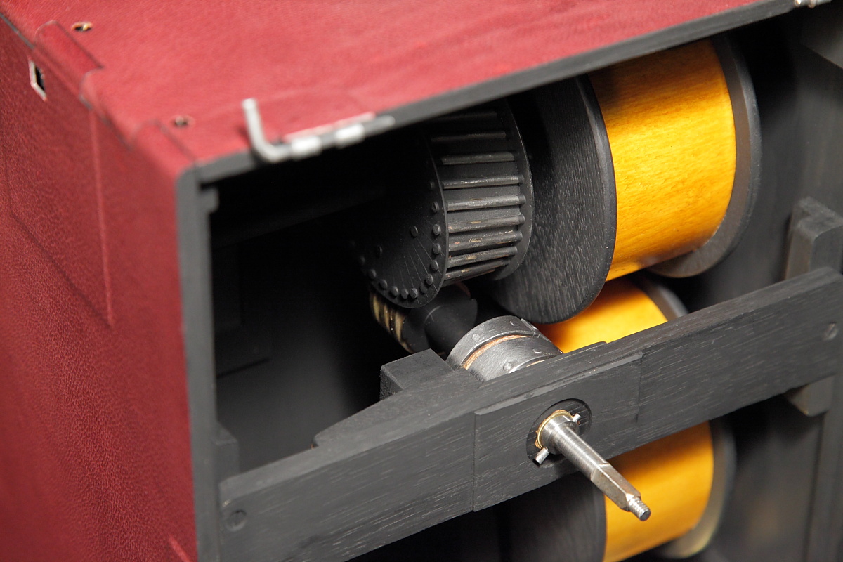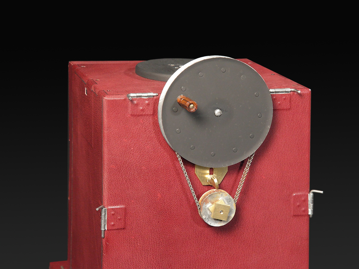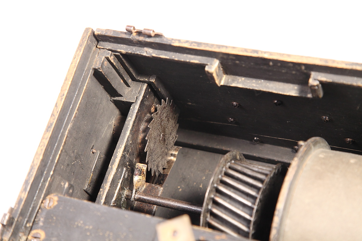 The working replica of the camera designed and built c.1894 (or earlier) by Max and Emil Skladanowsky, brothers in a family of magic lantern showmen, is a faithfully copy of the surviving machine.The rather crudely constructed camera was designed to accept unperforated celluloid film, and used a worm-gear intermittent movement, to shoot their first film footage, forty eight frames, of Emil.By mid summer 1895 Max had developed the Bioskop projector, a device using two loops of film.