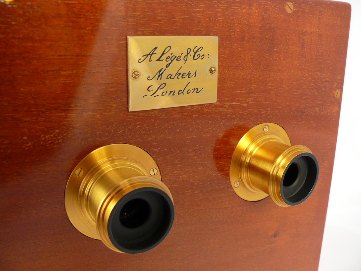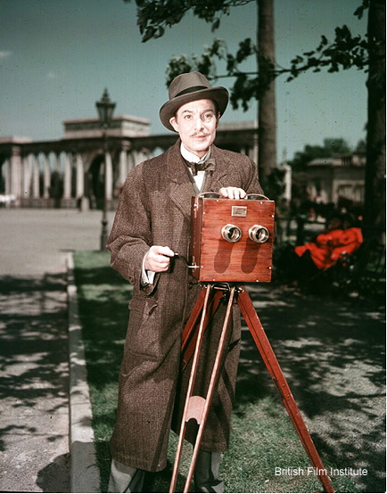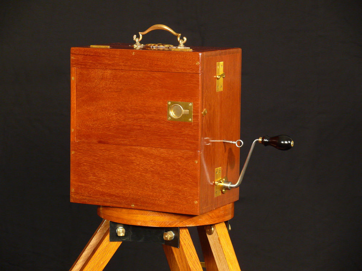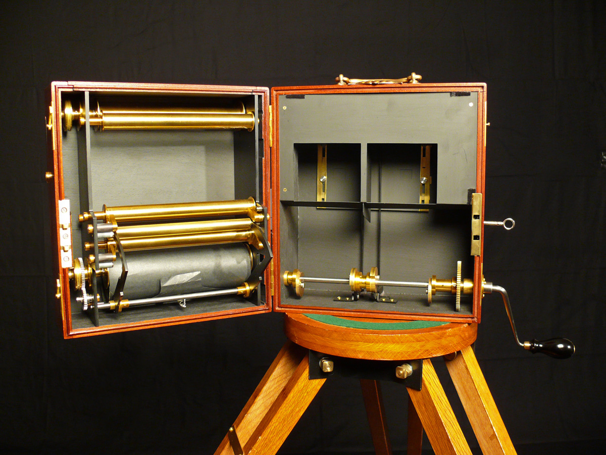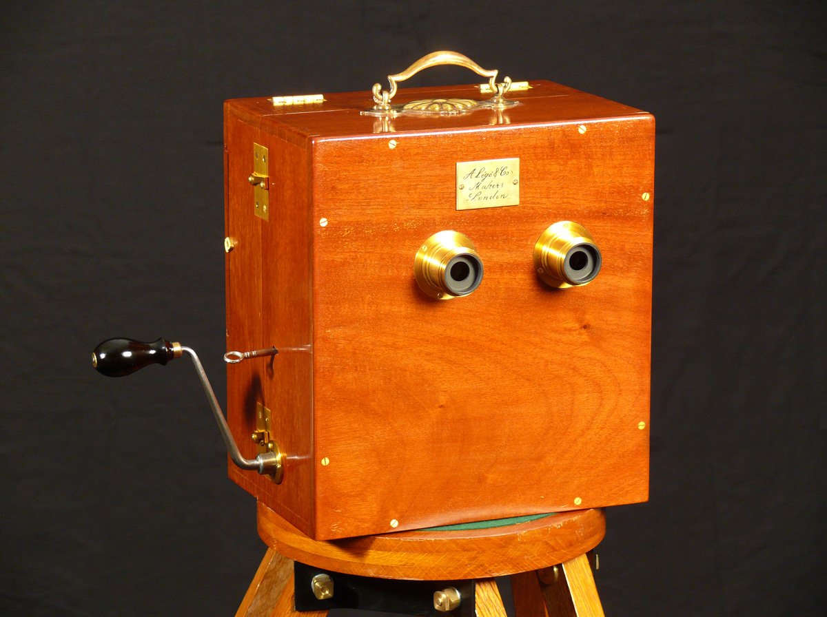 In 1890, Frederick Varley patented a sequence camera for stereoscopic images. Friese-Greene demonstrated this camera and in 1893 patented his own version, which was almost identical. A replica of this camera is featured in several scenes and publicity shots for the feature film biography The Magic Box (1951), in which actor Robert Donat played Willie Friese-Greene, establishing it as one of the icons of early cinema. An initial test of the replica indicates that it works well, albeit at a low frame rate (as expected), and the resulting images can be viewed stereoscopically to good effect. Despite the famous scene in The Magic Box which has Friese-Greene using the mechanism as a projector to the amazement of a watching policeman (Laurence Olivier), there is no workable provision for successful motion picture projection. The frame rate is too low, unperforated film would not have registered sufficiently well, and the flicker would have made the result completely unwatchable. But we shall, nevertheless, make an attempt to project with the camera, just to confirm our conclusions. |