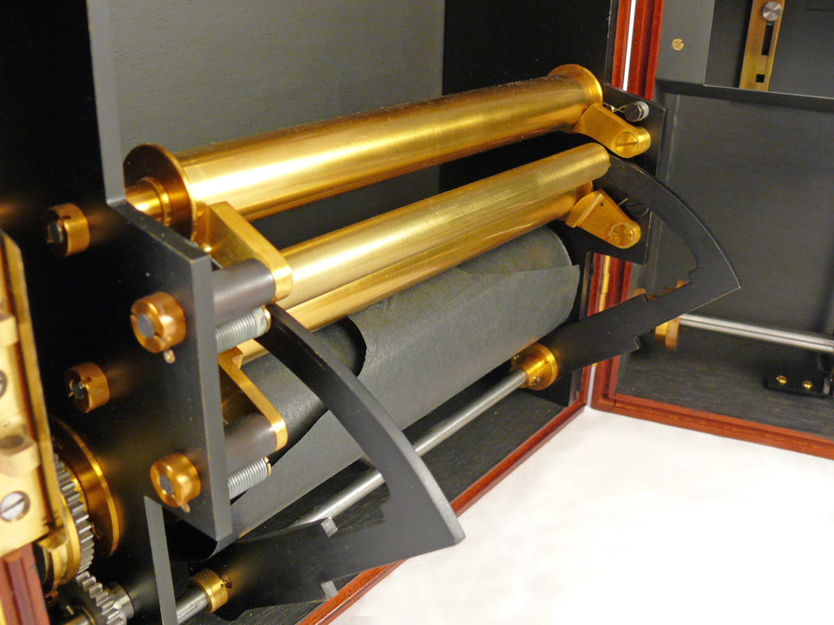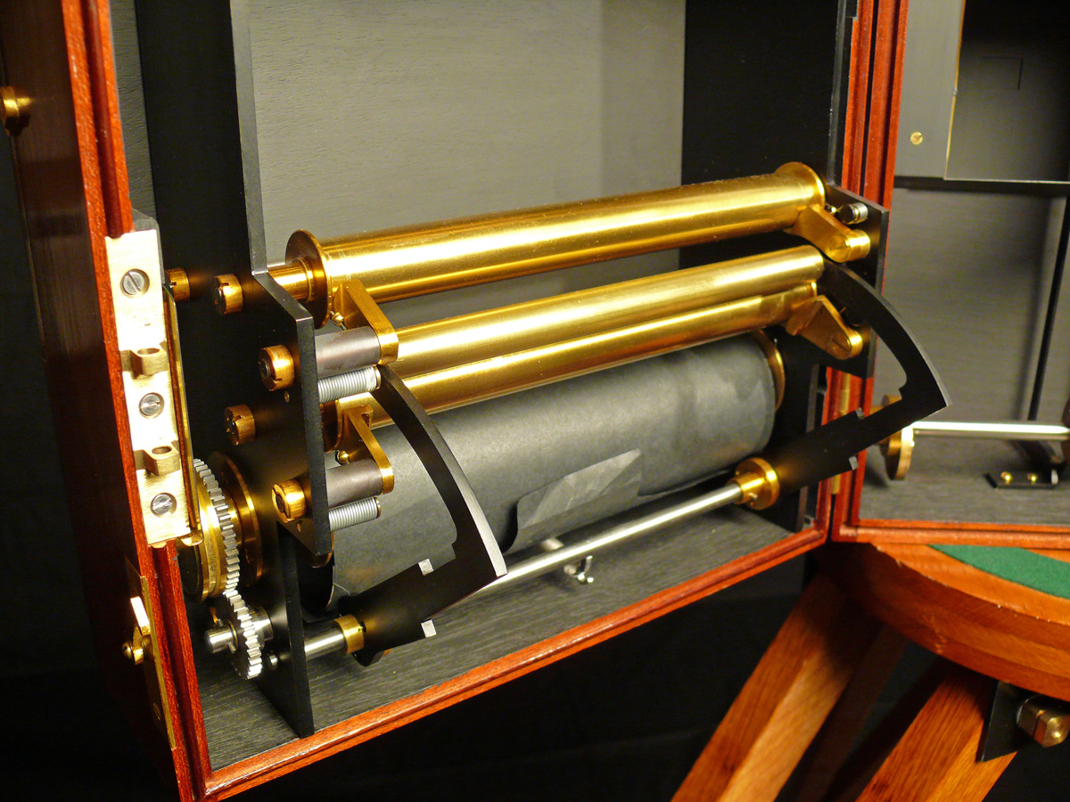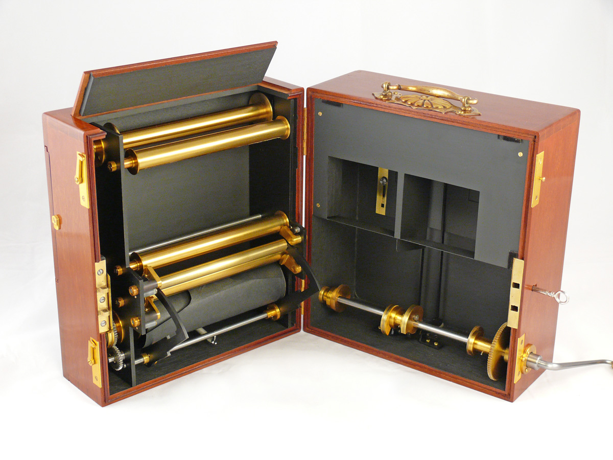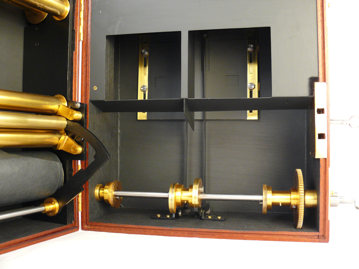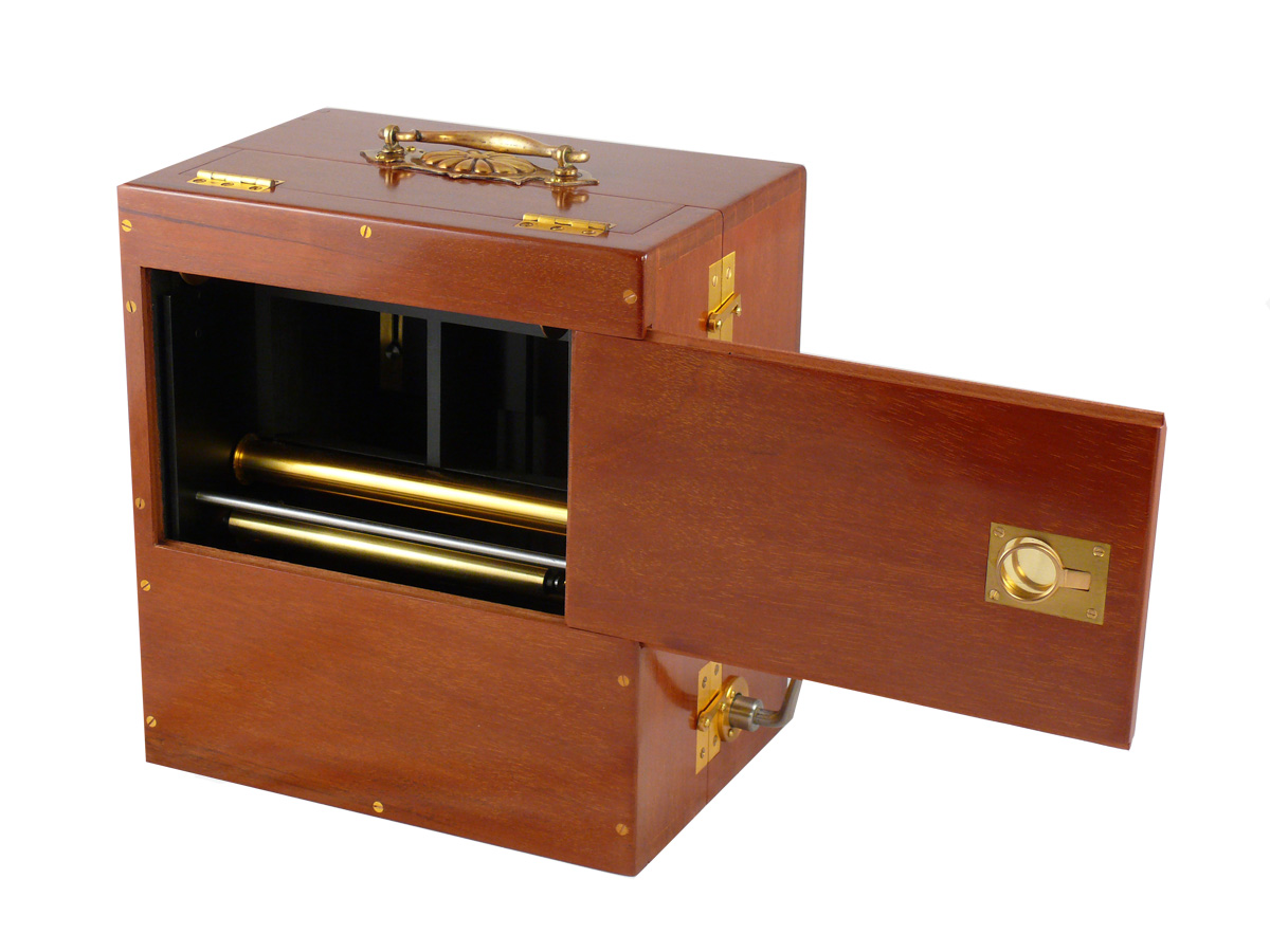 In 1890, Frederick Varley patented a sequence camera for stereoscopic images. Friese-Greene demonstrated this camera and in 1893 patented his own version, which was almost identical. A replica of this camera is featured in several scenes and publicity shots for the feature film biography The Magic Box (1951), in which actor Robert Donat played Willie Friese-Greene, establishing it as one of the icons of early cinema. An initial test of the replica indicates that it works well, albeit at a low frame rate (as expected), and the resulting images can be viewed stereoscopically to good effect. Despite the famous scene in The Magic Box which has Friese-Greene using the mechanism as a projector to the amazement of a watching policeman (Laurence Olivier), there is no workable provision for successful motion picture projection. The frame rate is too low, unperforated film would not have registered sufficiently well, and the flicker would have made the result completely unwatchable. But we shall, nevertheless, make an attempt to project with the camera, just to confirm our conclusions. |
